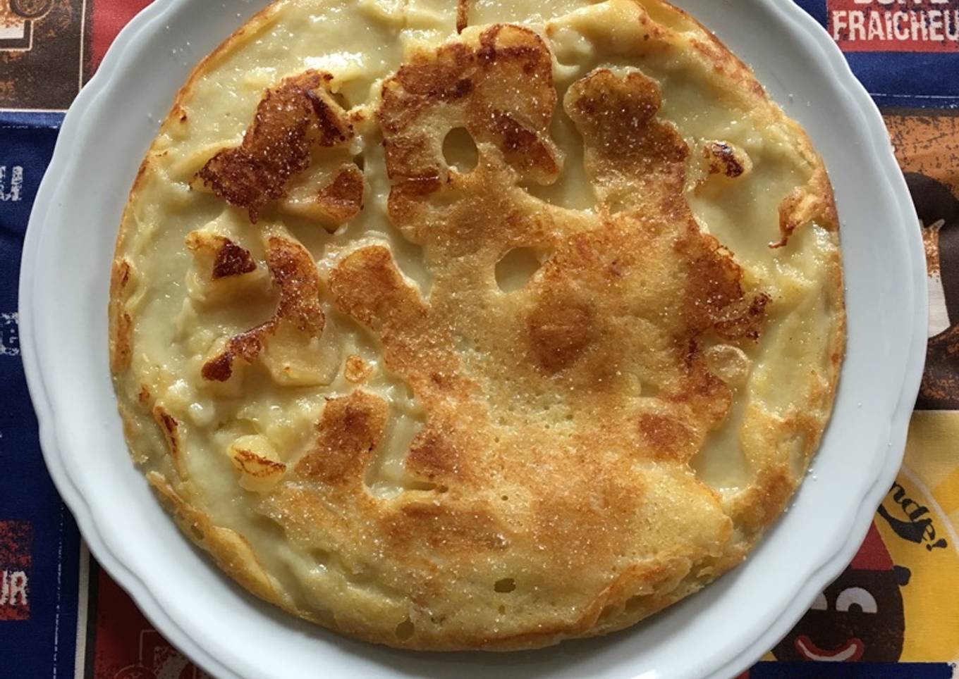- Quand les pommes sont presque cuites, verser la pâte dans la sauteuse pour faire comme une crêpe une peu épaisse. Laisser dorer puis retourner pour dorer l’autre côté.