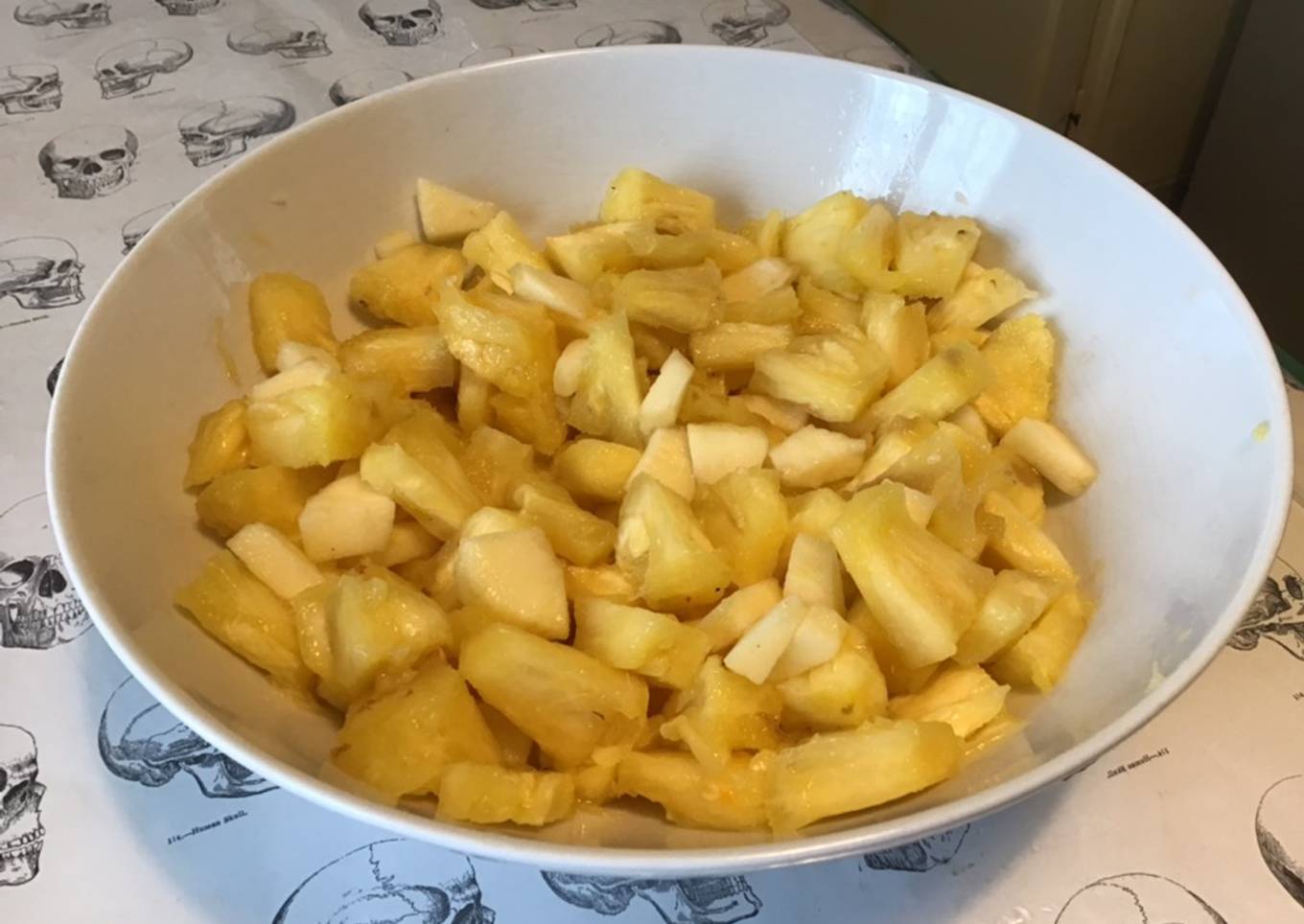 - Couper les quartiers de pomme en morceaux mettre ananas et pomme dans un grand saladier